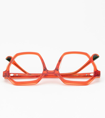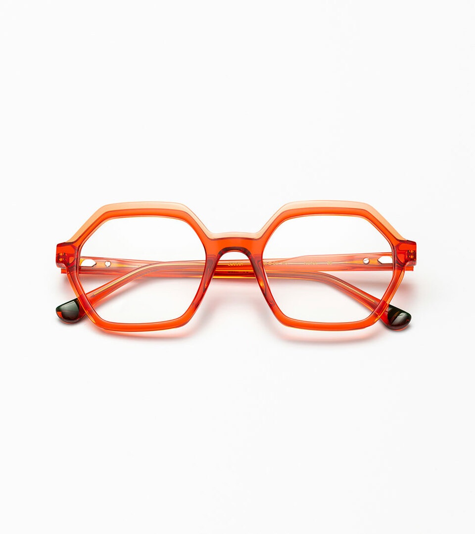 Le modèle Nona est fabriqué en acétate transparent avec un double fraisage, qui donne forme à un design hexagonal. Il est doté de branches pourvues d’une incrustation de bois sur les manchons et de charnières allemandes OBE Spike.